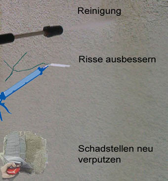 Die verschiedenen Luftschadstoffe und Witterungseinflüsse bewirken jedoch bei jeder Fassade Abnutzung bzw. Verschleiß, was sich je nach Dauer und Stärke der Einwirkungen in Putzrissen, Algen-, Moos- oder Pilzflecken, machmal auch im stellenweisen Abblättern des Putzes zeigt.
